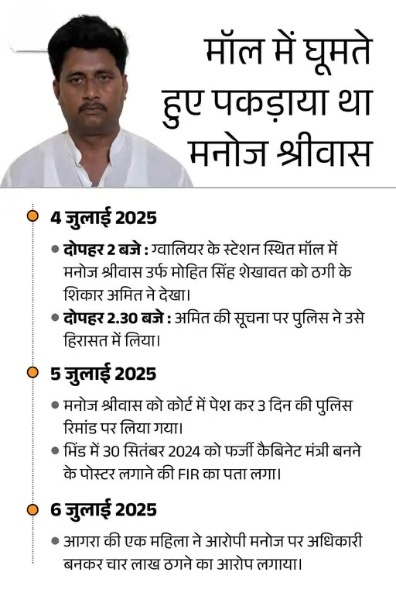 पता लगा है कि सितंबर 2024 में भिंड के गोहद में आरोपी मनोज श्रीवास पूरे गोहद में अपने पोस्टर लगवा दिए थे। जिसमें मध्य प्रदेश राज्य राष्ट्रीय पिछड़ा वर्ग और दिव्यांगजन वित्त एवं विकास निगम में कैबिनेट मंत्री का दर्जा प्रदान होना बताया गया था।