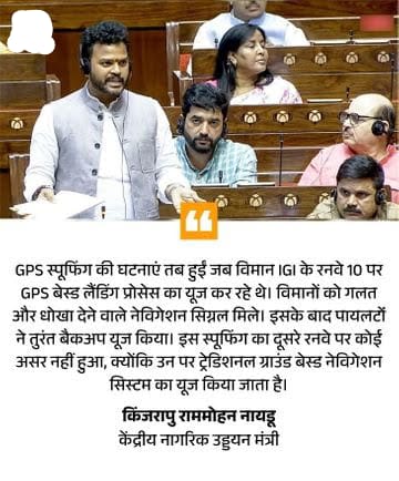 उन्होंने यह जानकारी सांसद एस. निरंजन रेड्डी के सवाल पर दी। रेड्डी ने पूछा था कि क्या सरकार को IGI पर हुई GPS स्पूफिंग की जानकारी है। DGCA-AAI की इससे बचने की क्या तैयारी है।