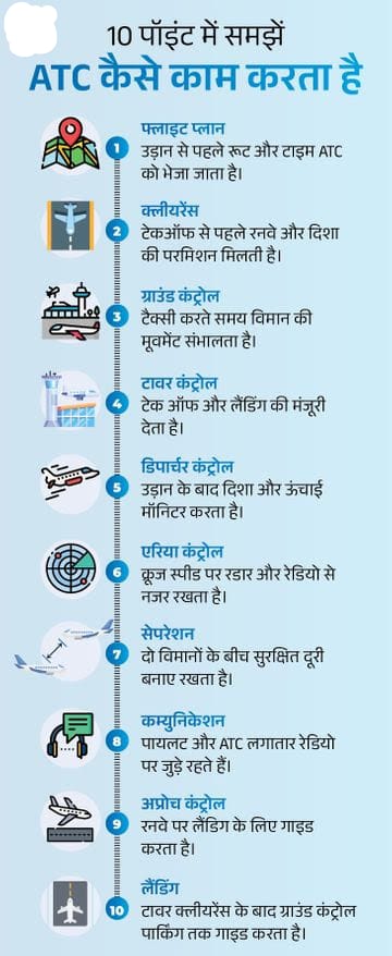 एयर ट्रैफिक कंट्रोल (ATC) एयरपोर्ट्स पर मौजूद सेंट्रल कंट्रोलिंग सिस्टम होता है। यह हवाई जहाजों को जमीन पर, हवा में और आसमान के अलग-अलग हिस्सों में निर्देश जारी करता है। आसान भाषा में कहा जाए तो यह ट्रैफिक पुलिस की तरह ही है, लेकिन सिर्फ हवाई जहाजों के लिए।