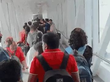 दिल्ली एयरपोर्ट के एयरोब्रिज पर शुक्रवार को यात्रियों की लंबी लाइन लगी रही।