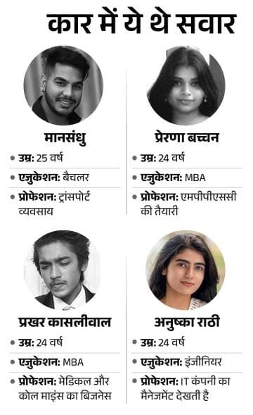 इस हादसे में कांग्रेस प्रदेश प्रवक्ता आनंद कासलीवाल के बेटे प्रखर कासलीवाल (25) और उनके साथी मानसंधु (26) की भी मौके पर ही मौत हो गई। अनुष्का राठी गंभीर रूप से घायल है और निजी अस्पताल में उसका इलाज जारी है।