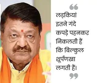 दो साल पहले भी लड़कियों के पहनावे पर दिया था बयान कैलाश विजयवर्गीय ने 2 साल पहले भी 12 अप्रैल 2023 को हनुमान जन्मोत्सव के मौके पर इंदौर में एक कार्यक्रम को संबोधित करते हुए लड़कियों के पहनावे पर कमेंट किया था। उन्होंने कहा था कि लड़कियां इतने गंदे कपड़े पहनकर निकलती हैं कि बिल्कुल शूर्पणखा लगती हैं।