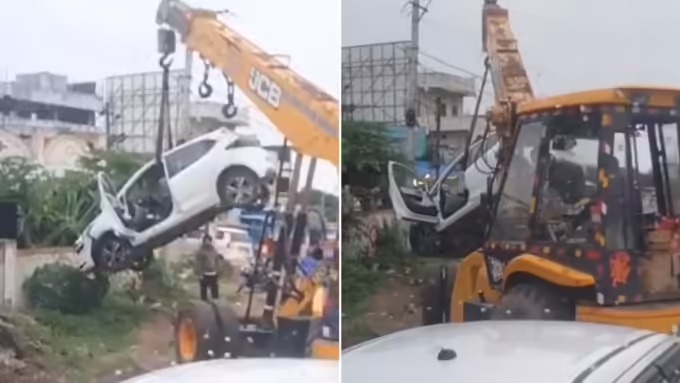 కారును క్రేన్ సహాయంతో దింపిన ట్రాఫిక్ పోలీసులు pic.twitter.com/PZUcNw0KW7