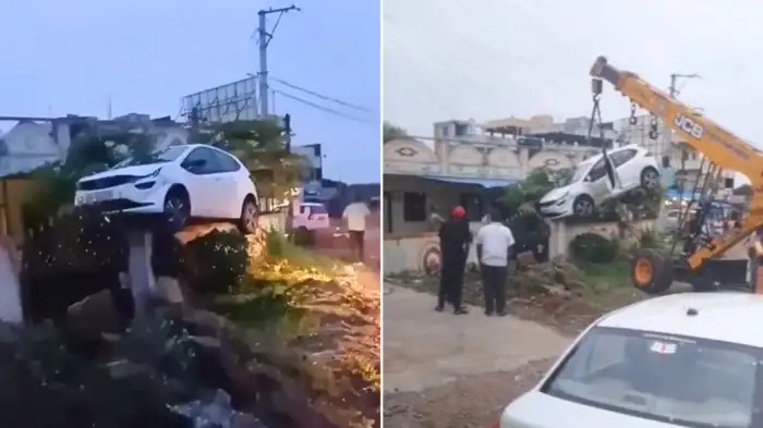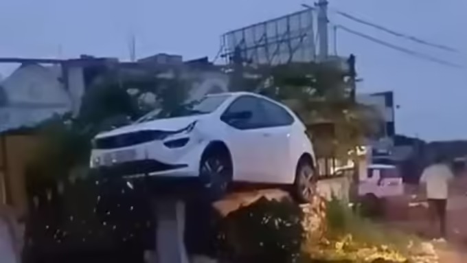 जानकारी मिलने पर ट्रैफिक पुलिस मौके पर पहुंची और क्रेन की मदद से टाटा अल्ट्रोज कार को दीवार से नीचे उतारा गया। इस घटना का वीडियो लोगों ने अपने कैमरे में रिकॉर्ड कर लिया, जो अब सोशल मीडिया पर तेजी से वायरल हो रहा है।