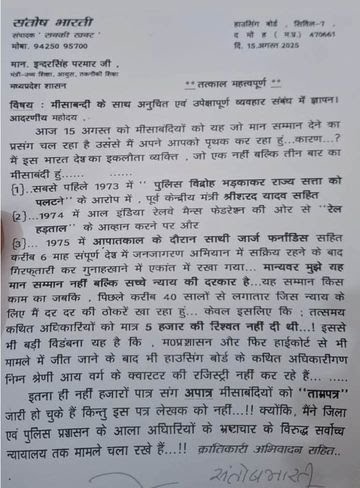 भारती ने कहा- सम्मान से खुद को अलग कर रहा हूं मीसाबंदी संतोष भारती ने जो आवेदन मंत्री के हाथों में दिया है उसमें लिखा है- आज 15 अगस्त को मीसाबंदियों को यह जो मान-सम्मान देने का प्रसंग चल रहा है, उससे मैं अपने आपको अलग कर रहा हूं। कारण…? मैं इस भारत देश का इकलौता व्यक्त्ति जो एक नहीं बल्कि तीन बार का मीसाबंदी हूं…..
