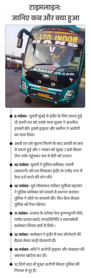 बस में तीन लोगों ने की छेड़छाड़ मामला इंदौर की एक युवती का है, जो मुंबई में एनिमेटर की जॉब करती है। 6 नवंबर की शाम वह गोरेगांव से हंस ट्रेवल्स की बस (AR-11 D-1919) से इंदौर के लिए रवाना हुई थी। बस रात 11.30 कसारा फूड स्टॉप पर रुकी। यहां हंस ट्रेवल्स के ही एक अन्य ड्राइवर ने बस ड्राइवर से कहा कि एक सवारी को बैठा लेना, उन्हें भी इंदौर ही जाना है। ड्राइवर और क्लीनर के साथ एक सरदार