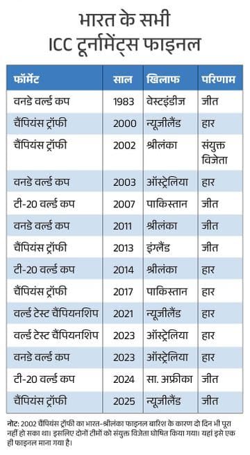 भारतीय क्रिकेट टीम ICC टूर्नामेंट के इतिहास में रिकॉर्ड 15वीं बार फाइनल खेलने उतरेगी। 1983 में कपिल देव की कप्तानी में मिली पहली वर्ल्ड कप जीत से शुरू हुआ यह सफर भारत को अब तक 7 ट्रॉफियां दिला चुका है।