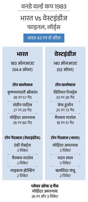 25 जून 1983 को लॉर्ड्स में कपिल देव की कप्तानी में भारत ने दो बार की चैंपियन वेस्टइंडीज को 43 रन से हराकर पहला वर्ल्ड कप जीता। भारत 54.4 ओवर में 183 रन पर ऑलआउट हुआ, जिसमें कृष्णमाचारी श्रीकांत (38), मोहिंदर अमरनाथ (26) और संदीप पाटिल (27) ने अहम पारियां खेलीं।