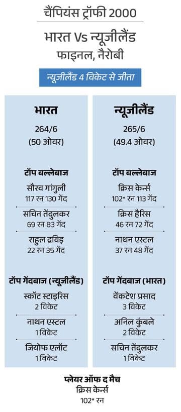 15 अक्टूबर 2000 को नैरोबी में ICC नॉकआउट (चैंपियंस ट्रॉफी) फाइनल में न्यूजीलैंड ने भारत को 4 विकेट से हराया। भारत ने गांगुली (117) और सचिन (69) की 141 रन की साझेदारी की मदद से 264 रन बनाए।