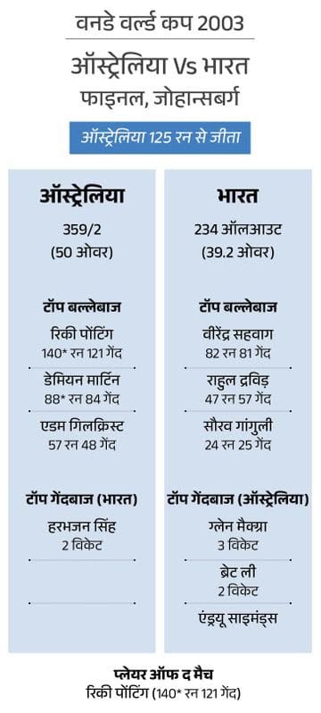 जोहान्सबर्ग में खेले गए वनडे वर्ल्ड कप फाइनल में ऑस्ट्रेलिया ने भारत को 125 रन से हराया। एडम गिलक्रिस्ट (57) और मैथ्यू हेडन (37) ने 105 रन की शुरुआत दी, फिर रिकी पोंटिंग ने 121 गेंदों में नाबाद 140 और डेमियन मार्टिन ने 88 रन बनाए। ऑस्ट्रेलिया ने 359/2 रन बनाए।