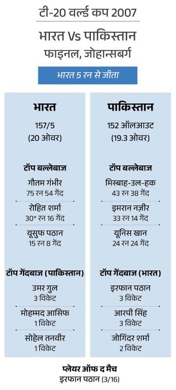 जोहान्सबर्ग में खेले गए पहले टी-20 वर्ल्ड कप फाइनल में भारत ने पाकिस्तान को 5 रन से हराया। भारत ने गौतम गंभीर (75) और रोहित शर्मा (30*) की मदद से 157/5 बनाए।