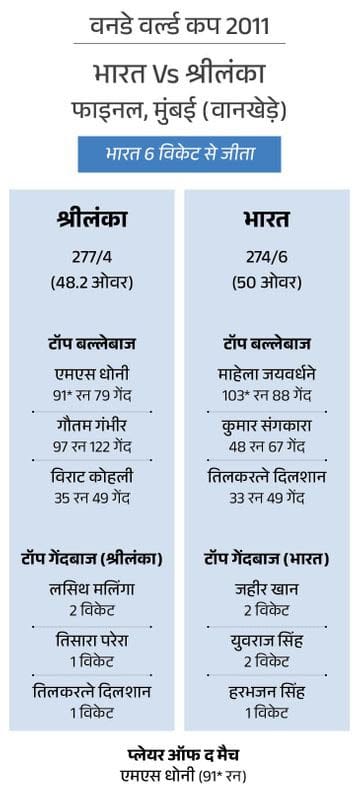मुंबई के वानखेड़े में भारत ने श्रीलंका को 6 विकेट से हराकर 28 साल बाद वनडे वर्ल्ड कप जीता। श्रीलंका ने महेला जयवर्धने (103*) की मदद से 274/6 बनाए। भारत की शुरुआत खराब रही, लेकिन गौतम गंभीर (97) और विराट कोहली (35) ने साझेदारी की। इसके बाद धोनी (91*) ने युवराज (21*) के साथ मैच खत्म किया और नुवान कुलसेकरा की गेंद पर छक्का लगाकर भारत को जीत दिलाई।
