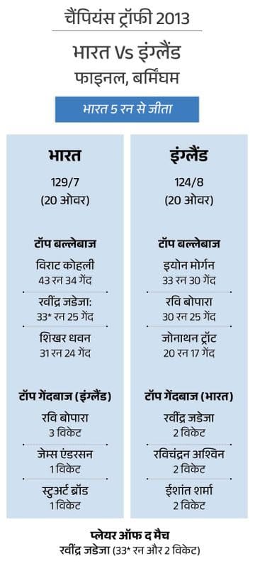 बर्मिंघम में बारिश के कारण चैंपियंस ट्रॉफी का फाइनल 20-20 ओवर का हुआ। भारत ने 129/7 बनाए, कोहली (43) और जडेजा (33*) ने अहम योगदान दिया। इंग्लैंड की पारी में ओएन मॉर्गन (33) और रवि बोपारा (30) ने टीम को करीब पहुंचाया, लेकिन ईशांत शर्मा ने लगातार दो विकेट लेकर मैच पलट दिया। आखिरी ओवर में अश्विन ने इंग्लैंड को 124/8 पर रोक दिया।