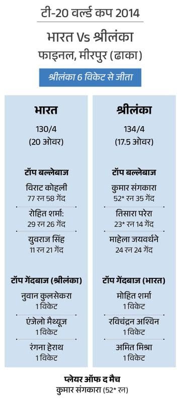बांग्लादेश के ढाका में खेले गए टी-20 वर्ल्ड कप फाइनल में भारत को श्रीलंका से 6 विकेट से हार मिली। भारत ने कोहली (77) रन की पारी से 130/4 बनाए। जवाब में कुमार संगकारा ने 52* रन बनाकर टीम को 17.5 ओवर में 134/4 तक पहुंचा दिया। कोहली 319 रन के साथ प्लेयर ऑफ द सीरीज बने