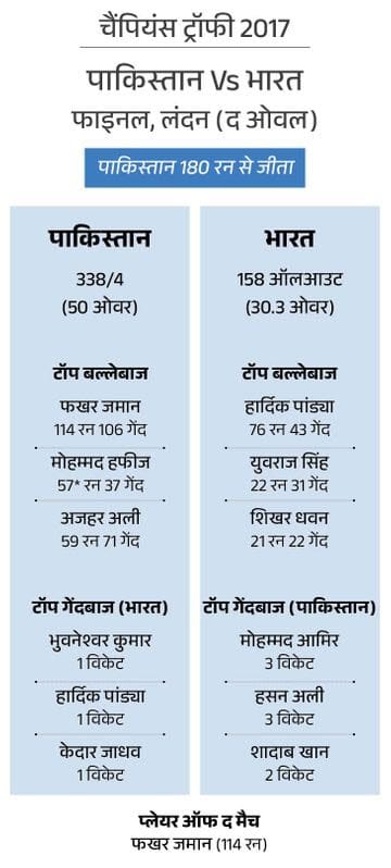 ओवल में खेले गए चैंपियंस ट्रॉफी फाइनल में पाकिस्तान ने 338/4 बनाए। फखर जमान ने 114, अजहर (59) और बाबर (46) ने योगदान दिया। जवाब में मोहम्मद आमिर ने रोहित, धवन और कोहली को आउट कर भारत को झटका दिया। हार्दिक पंड्या (76) ने संघर्ष किया, लेकिन भारत 158 रन पर ऑलआउट हो गया।
