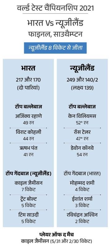 इंग्लैंड के साउथेम्प्टन में खेले गए पहले वर्ल्ड टेस्ट चैंपियनशिप (WTC) फाइनल में न्यूजीलैंड ने भारत को 8 विकेट से हराया। भारत 217 और 170 रन ही बना सका।