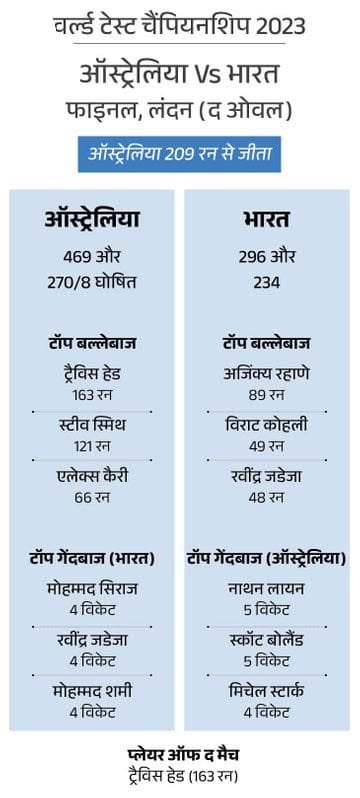 द ओवल में खेले गए WTC फाइनल में ऑस्ट्रेलिया ने भारत को 209 रन से हराया। पहली पारी में ट्रैविस हेड ने 163 रन बनाए और टीम 469 तक पहुंची। भारत 296 और 234 रन ही बना सका। 444 रन के लक्ष्य का पीछा करते हुए कोहली (49) और रहाणे (46) ने संघर्ष किया, लेकिन टीम हार गई।