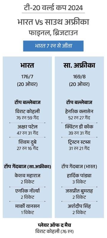वेस्टइंडीज के ब्रिजटाउन में खेले गए फाइनल में भारत ने साउथ अफ्रीका को 7 रन से हराया। इसी के साथ भारत ने 17 साल बाद टी-20 वर्ल्ड का खिताब दूसरी बार अपने नाम किया। टीम ने पहले बैटिंग करते हुए विराट कोहली (76), अक्षर पटेल (47) और दुबे (27) की मदद से 176/7 रन बनाए।