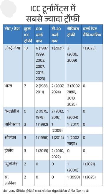 इसके अलावा न्यूजीलैंड ने 2 ट्रॉफी (2000 चैंपियंस ट्रॉफी और 2021 वर्ल्ड टेस्ट चैंपियनशिप) जीती हैं, जबकि साउथ अफ्रीका के नाम भी 2 खिताब (1998 चैंपियंस ट्रॉफी और 2025 वर्ल्ड टेस्ट चैंपियनशिप) हैं