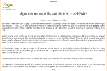 भारतीय डाक विभाग 25 अगस्त से अमेरिका के लिए ज्यादातर डाक सामानों की बुकिंग सस्पेंड करने जा रहा है। फिलहाल ये फैसला अस्थायी रूप से लागू होगा। 23 अगस्त को डाक विभाग ने एक प्रेस नोट जारी करके इसकी जानकारी दी।