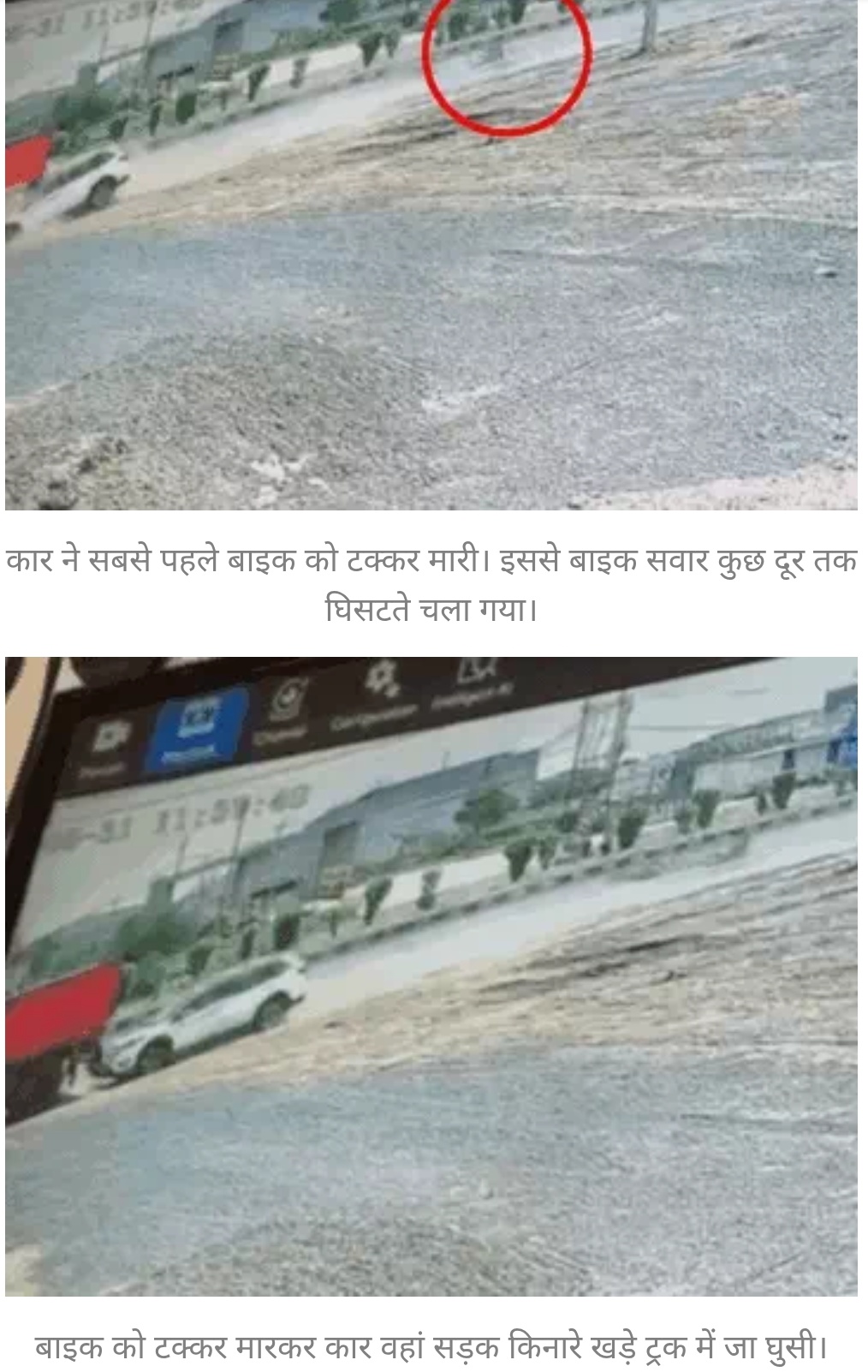 बाइक सवार भी उछलकर दूर जा गिरा सीसीटीवी फुटेज में देखा जा सकता है कि ट्रक से टकराने से पहले कार एक बाइक सवार को अपनी चपेट में ले लेती है। कार की टक्कर से बाइक सवार उछलकर जमीन पर गिर जाता है। बाइक सवार भी हॉस्पिटल में भर्ती है। कार चालक पुष्पक के खिलाफ गैर इरादतन हत्या का मामला दर्ज कर लिया है। पुष्पक गंभीर चोटों के कारण अभी भी बेहोश है।