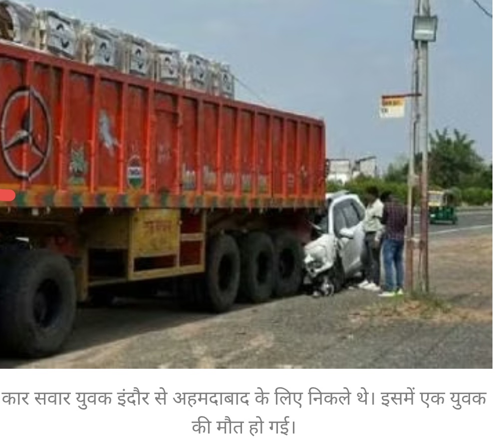 इंदौर से अहमदाबाद जा रहे चार दोस्तों की कार बाइक को टक्कर मारते हुए खड़े ट्रक में जा घुसी। हादसे में एक युवक की मौत हो गई। कार में सवार एक युवक की अहमदाबाद में आइसक्रीम की दुकान का उद्घाटन होना था। वह अपने तीन दोस्तों के साथ निकला था।