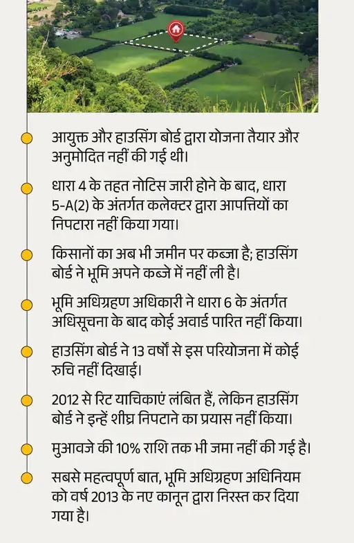 पालाखेड़ी में लगभग 375 एकड़ जमीन पर हाउसिंग बोर्ड ने आवासीय योजना प्रस्तावित की थी, जिसमें 102 किसानों की जमीन अधिगृहित की जानी थी। इस अधिग्रहण के विरोध में किसानों ने 42 याचिकाएं दायर की थीं।