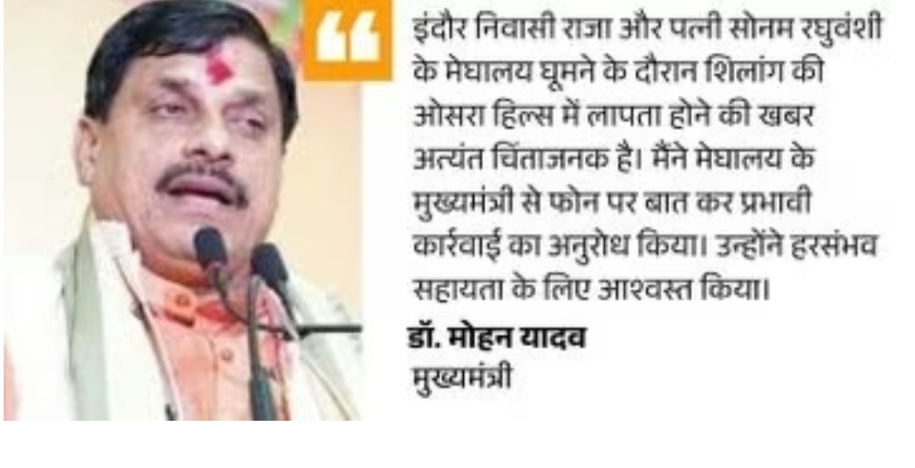 डॉ. मोहन यादव ने मेघालय के सीएम से की बात सीएम डॉ. मोहन यादव ने मामले की गंभीरता को देखते हुए मेघालय के मुख्यमंत्री कॉनराड संगमा से फोन पर बात की है। मैंने मध्यप्रदेश के वरिष्ठ अधिकारियों को भी इस मामले में मेघालय प्रशासन से निरंतर संपर्क में रहने और समन्वय के निर्देशित किया है। सीएम ने सोशल मीडिया हैंडल एक्स पर लिखा,