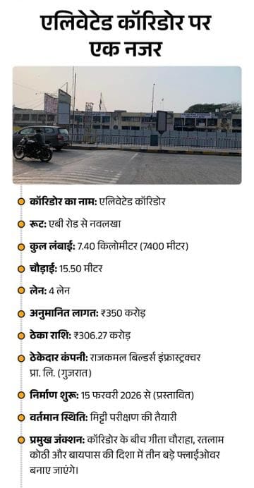 इंदौर में बनने जा रहे एलिवेटेड कॉरिडोर का काम शुरू हो गया है। एबी रोड से नवलखा तक बनने वाले 7.40 किमी लंबे एलिवेटेड कॉरिडोर का काम पीडब्ल्यूडी (PWD) ने धरातल पर शुरू कर दिया है। फिलहाल मिट्टी परीक्षण का काम चल रहा है, जिसके लिए सड़क के एक हिस्से को लोहे के पतरों से कवर किया गया है। पीडब्ल्यूडी 15 फरवरी से फाउंडेशन (नींव) भरने का काम शुरू करेगा। पीडब्ल्यूडी ने सेंट्रल लाइन मार्किंग का काम पूरा कर लिया है।