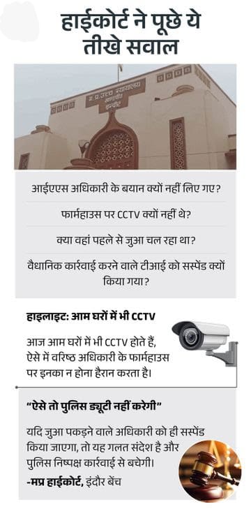 इंदौर के चर्चित जुआकांड में सस्पेंड टीआई के मामले ने नया मोड़ ले लिया है। हाईकोर्ट में सोमवार को सुनवाई के दौरान जहां पुलिस की कार्रवाई पर सख्त सवाल उठे, वहीं टीआई ने आरोप लगाया कि जुआ पकड़ने के बाद उन पर महिला आईएएस अधिकारी का नाम एफआईआर से हटाने का दबाव बनाया गया