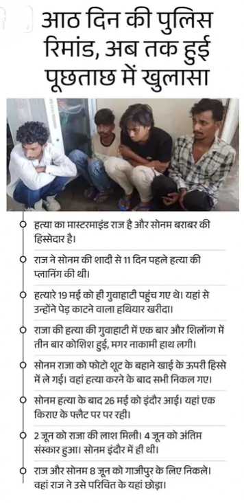 बता दें कि 11 मई को शादी के बाद 21 मई को राजा-सोनम शिलॉन्ग पहुंचे थे। 23 मई को परिवार से आखिरी बार बात हुई थी। 2 जून को राजा का शव मिला था। 17 दिन से गायब सोनम 9 जून को गाजीपुर में मिली थी। इसके बाद ही हत्याकांड का खुलासा हुआ था।