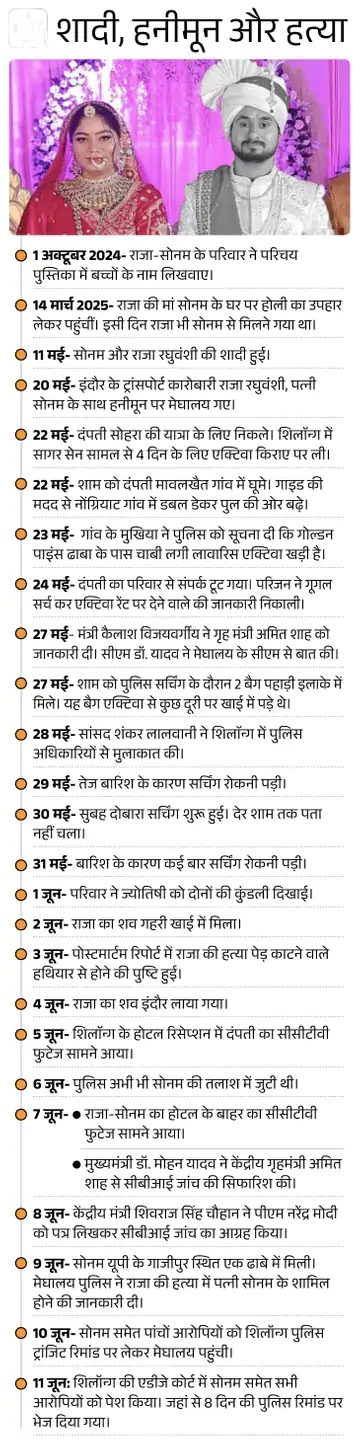 बता दें कि 11 मई को शादी के बाद 21 मई को राजा-सोनम शिलॉन्ग पहुंचे थे। 23 मई को परिवार से आखिरी बार बात हुई थी। 2 जून को राजा का शव मिला था। 17 दिन से गायब सोनम 9 जून को गाजीपुर में मिली थी। इसके बाद ही हत्याकांड का खुलासा हुआ था।