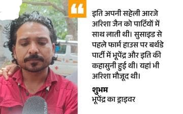 भूपेन्द्र के बर्थडे पर भी हुई थी कहासुनी ड्राइवर ने बताया कि खुड़ैल के फार्म हाउस पर बर्थडे पार्टी में भूपेन्द्र और इति की कहासुनी हुई थी। यहां भी वह अपनी सहेली आरिशी के साथ आई थी। वे दोनों यहां काफी देर तक रुकी। बाद में भूपेन्द्र ने दोनों को अपनी कार से उनके घर छुड़वाया था। यह फार्म हाउस भूपेन्द्र का था। यहां 22 जुलाई को उनकी बर्थडे पार्टी थी। इसमें भूपेन्द्र के कई दोस्त भी शामिल हुए थे। भूपेंद्र और इति पार्टी के बाद यहां काफी देर तक बैठे थे। उनके बीच पहले नॉर्मल बात हो रही थी, लेकिन बीच में भूपेन्द्र गुस्से में दिख रहा था।