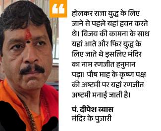 हर साल इसलिए निकलती है प्रभात फेरी पुजारी पं. दीपेश व्यास का कहना है कि सीताजी के हरण के बाद वानर राज सुग्रीव के आदेश पर वानर सेना उनका पता लगाने गई थी। हनुमान जी उनका पता लगाकर लौटे थे। यह खबर जब भगवान राम ने सुनी तो उन्होंने कहा कि हनुमान तुम रण को जीतकर आए हो। लंका को जलाकर आए हो इसलिए आज से मैं तुम्हें रणजीत नाम प्रदान करता हूं। इसके बाद वहां लाखों वानरों ने हनुमान जी को कंधे पर बैठाकर पूरे जंगल में परिभ्रमण कराया था। इसी के प्रतीकात्मक स्वरूप पौष अष्टमी पर यह यात्रा निकलती है।
