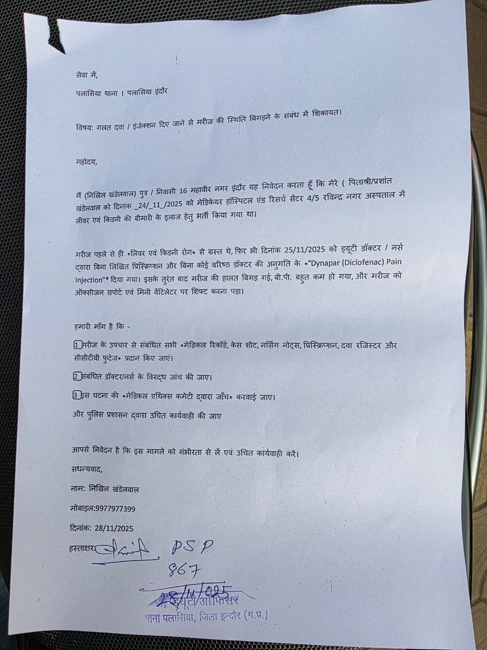 संभवतः किडनी पेशेंट को दर्द का इंजेक्शन डायनापार या और कोई सा इंजेक्शन नहीं दिया जाता है मगर हॉस्पिटल की लापराही से 63 वर्षीय मरीज जिंदगी और मौत से लड़ने को मजबूर हो गया है वही परिजनों ने मेडिकेयर हॉस्पिटल प्रबंधन से जब पूरे मामले की शिकायत की गई तो प्रबंधन का कहना हैकि प्रशांत खंडेलवाल को डायनापार इंजेक्शन नहीं लगाया गया है बल्कि पास वाले मरीज को लगाया गया था फिलहाल मरीज की हालत नाजुक बनी हुई है