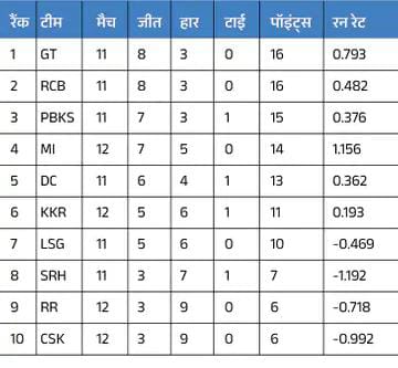 गुजरात टॉप पर, 3 टीमें बाहर IPL बीच में रोके जाने तक लीग स्टेज के 57 मैच खत्म हो चुके थे। 58वां मैच बीच में रोका गया। 57 मैच के बाद पॉइंट्स टेबल में गुजरात टाइटंस और रॉयल चैलेंजर्स बेंगलुरु के सबसे ज्यादा 16-16 पॉइंट्स रहे। बेहतर रन रेट के कारण GT टॉप पर रही। पंजाब तीसरे, मुंबई चौथे और दिल्ली पांचवें नंबर पर थी। वहीं चेन्नई, राजस्थान और हैदराबाद की टीमें प्लेऑफ की रेस से बाहर हो गईं।