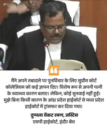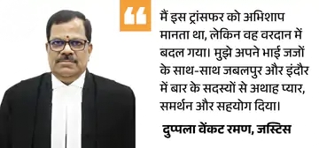 मप्र हाईकोर्ट की इंदौर बेंच के जज जस्टिस दुप्पला वेंकट रमण ने कहा कि 2023 में गृह राज्य आंध्र प्रदेश से दुर्भावना और परेशान करने के लिए उनका ट्रांसफर मध्य प्रदेश हाईकोर्ट किया गया। जस्टिस रमण 2 जून को रिटायर हो रहे हैं। मंगलवार को अपने विदाई समारोह को संबोधित करते हुए उन्होंने ये बात कही।