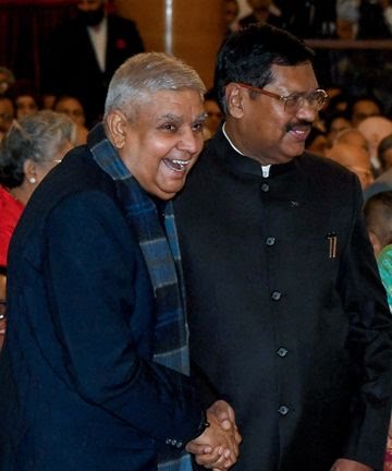 पूर्व वाइस प्रेसिडेंट जगदीप धनखड़ और पूर्व CJI भूषण रामकृष्ण गवई सोमवार को नई दिल्ली में राष्ट्रपति भवन के गणतंत्र मंडप में नजर आए।