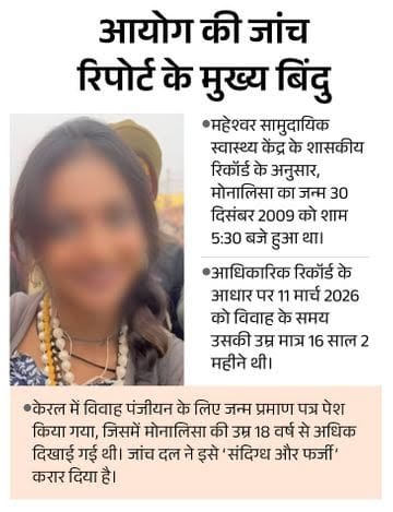 शिकायत के बाद आयोग की टीम ने जांच की। महेश्वर अस्पताल रिकॉर्ड में लड़की का जन्म 30 दिसंबर 2009 दर्ज मिला। 11 मार्च 2026 को शादी के समय उसकी उम्र 16 साल 2 महीने थी।नगर पालिका महेश्वर के फर्जी जन्म प्रमाण पत्र से केरल के पुअर गांव में विवाह पंजीयन कराया गया था, जिसे निरस्त करने की कार्रवाई चल रही है।जांच में पाया गया कि आरोपी और पीड़िता तीन महीने से वीआईपी होटलों में ठहर रहे थे। मामले की जांच आदिवासी बच्चों की तस्करी के एंगल से भी की गई।