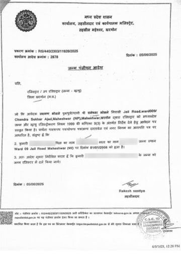 नगर परिषद का पक्ष: सीएमओ प्रियंका पांडेय के अनुसार, मई 2025 में मां ने शपथ पत्र दिया था कि जन्म घर पर हुआ है। तहसीलदार के आदेश पर 5 जून 2025 को प्रमाण पत्र जारी हुआ। अब जांच के बाद इसे रद्द कर दिया गया है।