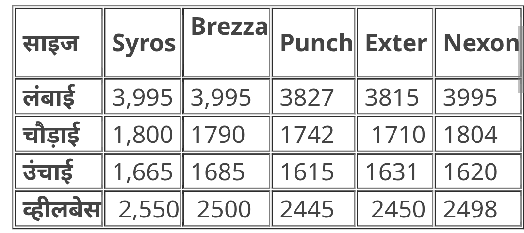 जहां तक साइज की बात है तो Syros लंबाई में टाटा पंच और एक्स्टर से ज्यादा बड़ी है. वहीं चौड़ाई में ये ब्रेजा को भी पीछे छोड़ती नज़र आ रही है. हालांकि उंचाई में मारुति ब्रेजा सबसे आगे है. इसके अलावा Syros का व्हीलबेस सबसे ज्यादा है, जो इसे बेहतर केबिन स्पेस प्रदान करने में मदद करेगा.