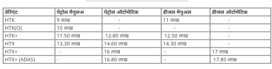 इस एसयूवी में आगे और पीछे वेंटिलेटेड सीटें, पैनोरमिक सनरूफ, पावर्ड ड्राइवर सीट, डुअल-ज़ोन क्लाइमेट कंट्रोल, प्रीमियम ऑडियो सिस्टम, एम्बिएंट लाइटिंग और पीछे AC वेंट जैसे कुछ ख़ास फीचर्स दिए गए हैं. इसके अलावा इसमें सेफ्टी का भी पूरा ख्याल रखा गया है. इसमें 6 एयरबैग और लेवल-2 ADAS सूट मिलेगा, जो सेल्टोस में देखा गया है. इसमें इलेक्ट्रॉनिक ब्रेकफोर्स डिस्ट्रिब्यूशन (EBD) के साथ एंटी लॉक ब्रेकिंग सिस्टम (ABS), रियर पार्किंग सेंसर, हिल-होल्ड असिस्ट, 360-डिग्री कैमरा, स्पीड अलर्ट सिस्टम, ISOFIX चाइल्ड सीट एंकरेज जैसी सुविधा मिलेगी.