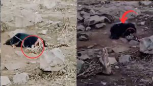 इस वीडियो में चैन से बंधे एक पहाड़ी कुत्ते को लेपर्ड से भिड़ते हुए देखा जा सकता है। इस पूरी क्लिप में यह कुत्ता एक बार भी तेंदुए को अपने ऊपर हावी नहीं होने देता। जैसे ही तेंदुआ फाइट बैंक करने की कोशिश करता है, वह उसे और बुरी पटखनी देता है। करीब 17 सेकंड में यह कुत्ता, तेंदुए को कई बार उठा-उठाकर पटकता है।