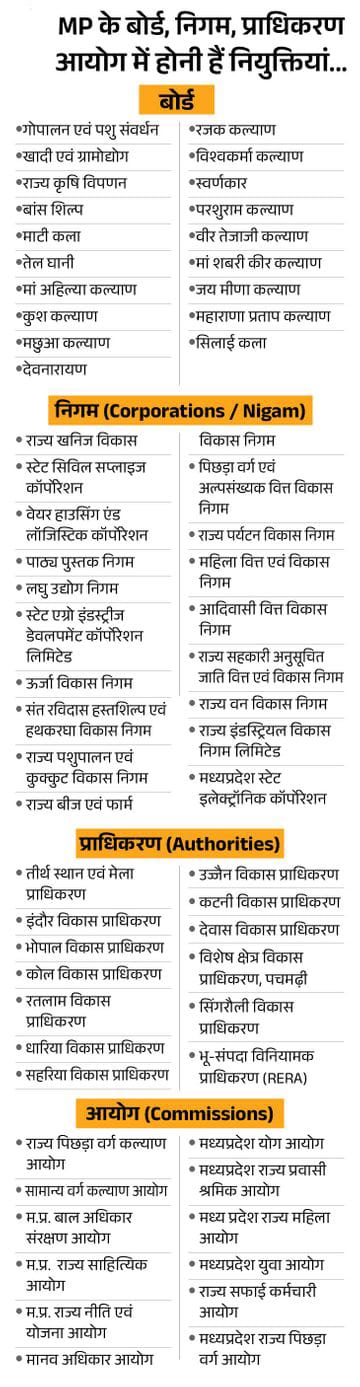 भाजपा के तत्कालीन राष्ट्रीय अध्यक्ष जेपी नड्डा के पास मध्य प्रदेश संगठन की ओर से करीब 15 प्राधिकरणों और निगमों के अध्यक्षों के नामों की प्रस्तावित सूची दिल्ली भेजी गई थी। केंद्रीय संगठन ने यह कहकर सूची वापस भेज दी कि जिले से लेकर प्रदेश स्तर तक जितने भी पदों पर नियुक्तियां होनी हैं, सबके लिए नाम मंगाकर पूरी सूची तैयार करें।