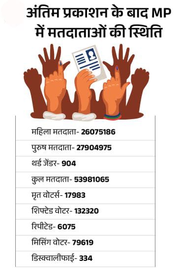 प्रदेश में अब 5 करोड़ 39 लाख 81 हजार 65 वोटर ड्राफ्ट के बाद दावे-आपत्तियों की प्रक्रिया में 10 लाख 85 हजार 413 नए नाम जोड़े गए, जबकि 2 लाख 36 हजार 331 नाम और हटाए गए। इस तरह शुद्ध रूप से 8 लाख 49 हजार 82 मतदाता बढ़े और अब प्रदेश में कुल मतदाताओं की संख्या 5 करोड़ 39 लाख 81 हजार 65 हो गई है। यह ड्राफ्ट के मुकाबले 1.60 प्रतिशत की वृद्धि है।