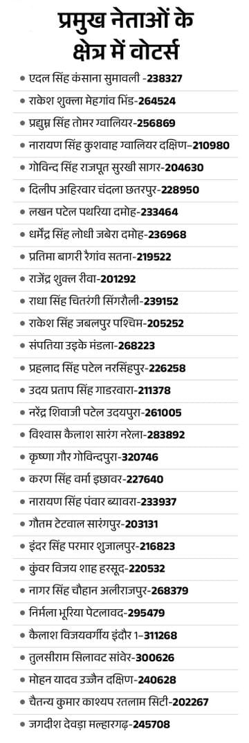 गोविंदपुरा में वोटर घटे, इंदौर-5 में सबसे ज्यादा मतदाता भोपाल के गोविंदपुरा में बड़े पैमाने पर नाम कटने से वहां कुल वोटर घट गए हैं। इसके उलट भोपाल के हुजूर विधानसभा क्षेत्र में मतदाता संख्या बढ़ी है और यह अब गोविंदपुरा से आगे निकल गया है। नई सूची के अनुसार इंदौर-5 विधानसभा में 3 लाख 52 हजार 849 मतदाता दर्ज किए गए हैं, जो प्रदेश में सबसे अधिक हैं। वहीं कोतमा में 1 लाख 39 हजार 559 मतदाता हैं, जो सबसे कम हैं।