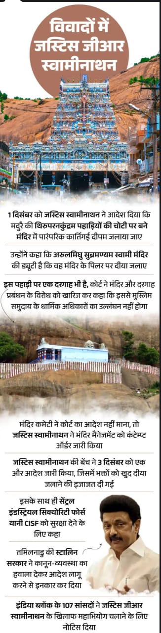 जस्टिस स्वामीनाथन का विरोध करने वालों में एडवोकेट सारनाथन अकेले नहीं हैं। मद्रास हाईकोर्ट के 8 से ज्यादा पूर्व जस्टिस और कई वकील भी उनका विरोध कर रहे हैं। DMK और इंडिया ब्लॉक के 120 सांसदों ने स्वामीनाथन को हटाने के लिए लोकसभा में महाभियोग का नोटिस दिया है।