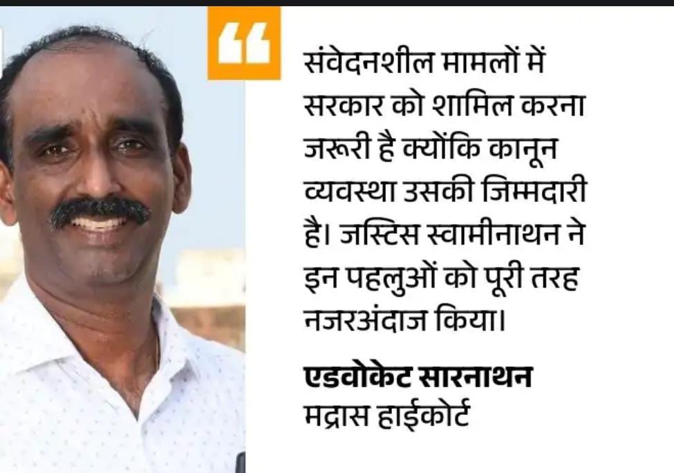 एडवोकेट सारनाथन जस्टिस स्वामीनाथन के जज बनने को ही गलत मानते हैं। वे कहते हैं कि वकालत के दौरान जस्टिस RSS विचारधारा के समर्थक थे। तब ये उनकी निजी राय हो सकती है, लेकिन जज बनना पूरी प्रक्रिया के विरुद्ध था। जज बनने के बाद भी वे निष्पक्ष नहीं रहे।