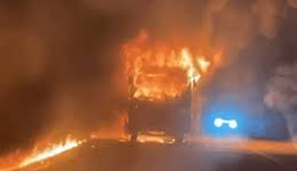 रायसेन. मध्य प्रदेश (MP) के रायसेन (Raisen) ज़िले में बम्हौरी ढाबे के पास मंगलवार देर रात एक बड़ा हादसा होते-होते टल गया. यहां इंदौर (Indore) से रीवा (Rewa) जा रही जय भवानी ट्रैवल्स की एक बस में चलते-चलते अचानक आग लग गई. बताया जा रहा है कि यह घटना रात करीब 1:30 बजे हुई. जानकारी के मुताबिक एक टायर फटने से चिंगारी निकली, जिसने कुछ ही पलों में आग का रूप ले लिया. आग इतनी तेज़ी से फैली कि बस से करीब 5 फीट ऊंची लपटें उठने लगीं. देखते ही देखते पूरी बस आग की लपटों में घिर गई और कुछ ही मिनटों में पूरी तरह जलकर खाक हो गई.