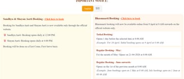 संध्या आरती: इसके लिए बुकिंग पोर्टल प्रतिदिन दोपहर 12:00 बजे खुलेगा। बुकिंग होने के पश्चात आरती दर्शन हेतु अंतिम प्रवेश समय सायं 6 बजे तक।